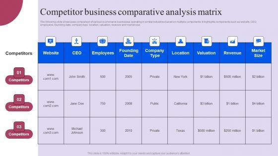 The following slide showcases comparison of various ecommerce businesses operating in similar industries based on multiple components. It highlights components such as website, CEO, employees, founding date, company type, location, valuation, revenue and market size. Get a simple yet stunning designed Competitor Business Comparative Analysis Matrix Ppt Model Images Pdf. It is the best one to establish the tone in your meetings. It is an excellent way to make your presentations highly effective. So, download this PPT today from Slidegeeks and see the positive impacts. Our easy to edit Competitor Business Comparative Analysis Matrix Ppt Model Images Pdf can be your go to option for all upcoming conferences and meetings. So, what are you waiting for Grab this template today. The following slide showcases comparison of various ecommerce businesses operating in similar industries based on multiple components. It highlights components such as website, CEO, employees, founding date, company type, location, valuation, revenue and market size.