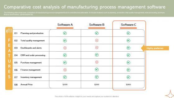 The following slide showcases comparison of manufacturing process management tools to select the best alternative. It includes features such as planning , production, total quality management, order processing, purchase, finance and inventory administration etc. Slidegeeks is here to make your presentations a breeze with Comparative Cost Analysis Of Manufacturing Automating Production Process Strategy SS V With our easy-to-use and customizable templates, you can focus on delivering your ideas rather than worrying about formatting. With a variety of designs to choose from, you are sure to find one that suits your needs. And with animations and unique photos, illustrations, and fonts, you can make your presentation pop. So whether you are giving a sales pitch or presenting to the board, make sure to check out Slidegeeks first The following slide showcases comparison of manufacturing process management tools to select the best alternative. It includes features such as planning , production, total quality management, order processing, purchase, finance and inventory administration etc.