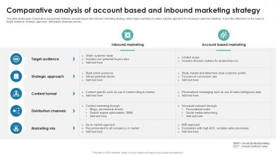 This slide showcases comparative assessment between account based and inbound marketing strategy which helps marketers to select suitable approach for increased customer retention. It provides difference on the basis of target audience, strategic approach, distribution channels and etc. Find highly impressive Comparative Analysis Of Account Based And Inbound Marketing Strategy PPT Presentation SS on Slidegeeks to deliver a meaningful presentation. You can save an ample amount of time using these presentation templates. No need to worry to prepare everything from scratch because Slidegeeks experts have already done a huge research and work for you. You need to download Comparative Analysis Of Account Based And Inbound Marketing Strategy PPT Presentation SS for your upcoming presentation. All the presentation templates are 100 percent editable and you can change the color and personalize the content accordingly. Download now This slide showcases comparative assessment between account based and inbound marketing strategy which helps marketers to select suitable approach for increased customer retention. It provides difference on the basis of target audience, strategic approach, distribution channels and etc.