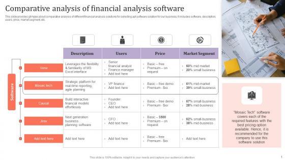 This slide provides glimpse about comparative analysis of different financial analysis solutions for selecting apt software solution for our business. It includes software, description, users, price, market segment, etc. If you are looking for a format to display your unique thoughts, then the professionally designed Comparative Analysis Of Financial Analysis Assessing Corporate Financial Techniques Guidelines Pdf is the one for you. You can use it as a Google Slides template or a PowerPoint template. Incorporate impressive visuals, symbols, images, and other charts. Modify or reorganize the text boxes as you desire. Experiment with shade schemes and font pairings. Alter, share or cooperate with other people on your work. Download Comparative Analysis Of Financial Analysis Assessing Corporate Financial Techniques Guidelines Pdf and find out how to give a successful presentation. Present a perfect display to your team and make your presentation unforgettable. This slide provides glimpse about comparative analysis of different financial analysis solutions for selecting apt software solution for our business. It includes software, description, users, price, market segment, etc.