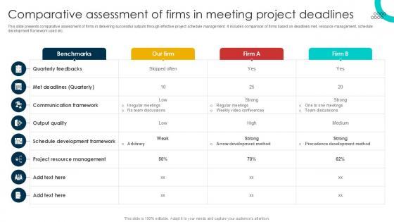 This slide presents comparative assessment of firms in delivering successful outputs through effective project schedule management. It includes comparison of firms based on deadlines met, resource management, schedule development framework used etc. Want to ace your presentation in front of a live audience Our Comparative Assessment Of Firms Schedule Management Techniques PPT Example can help you do that by engaging all the users towards you. Slidegeeks experts have put their efforts and expertise into creating these impeccable powerpoint presentations so that you can communicate your ideas clearly. Moreover, all the templates are customizable, and easy-to-edit and downloadable. Use these for both personal and commercial use. This slide presents comparative assessment of firms in delivering successful outputs through effective project schedule management. It includes comparison of firms based on deadlines met, resource management, schedule development framework used etc.