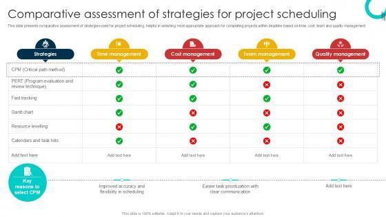 This slide presents comparative assessment of strategies used for project scheduling, helpful in selecting most appropriate approach for completing projects within deadline based on time, cost, team and quality management. There are so many reasons you need a Comparative Assessment Of Schedule Management Techniques PPT Slide. The first reason is you can not spend time making everything from scratch, Thus, Slidegeeks has made presentation templates for you too. You can easily download these templates from our website easily. This slide presents comparative assessment of strategies used for project scheduling, helpful in selecting most appropriate approach for completing projects within deadline based on time, cost, team and quality management.