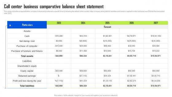 The slides cover the snapshot of the companys financial position at a specific time by showing the details of the assets of the company along with its liabilities and owners capital from the historical year 2023 till the forecasted year 2027. If your project calls for a presentation, then Slidegeeks is your go-to partner because we have professionally designed, easy-to-edit templates that are perfect for any presentation. After downloading, you can easily edit Call Center Business Comparative Balance Sheet IT And Tech Support Business Formats Pdf and make the changes accordingly. You can rearrange slides or fill them with different images. Check out all the handy templates The slides cover the snapshot of the companys financial position at a specific time by showing the details of the assets of the company along with its liabilities and owners capital from the historical year 2023 till the forecasted year 2027.