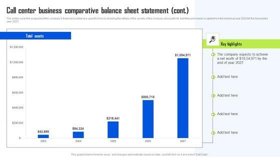The slides cover the snapshot of the companys financial position at a specific time by showing the details of the assets of the company along with its liabilities and owners capital from the historical year 2023 till the forecasted year 2027. Do you have to make sure that everyone on your team knows about any specific topic I yes, then you should give Call Center Business Comparative Balance Sheet Statement BPO Center Business Plan Rules Pdf a try. Our experts have put a lot of knowledge and effort into creating this impeccable Call Center Business Comparative Balance Sheet Statement BPO Center Business Plan Rules Pdf You can use this template for your upcoming presentations, as the slides are perfect to represent even the tiniest detail. You can download these templates from the Slidegeeks website and these are easy to edit. So grab these today. The slides cover the snapshot of the companys financial position at a specific time by showing the details of the assets of the company along with its liabilities and owners capital from the historical year 2023 till the forecasted year 2027.