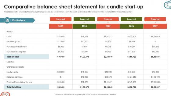 The slide covers the snapshot of the companys financial position at a specific time. It shows the assets and liabilities of the company from the year 2023 till the forecasted year 2027. Present like a pro with Candle Business Venture Comparative Balance Sheet Statement For Candle Start Up BP SS V. Create beautiful presentations together with your team, using our easy-to-use presentation slides. Share your ideas in real-time and make changes on the fly by downloading our templates. So whether you are in the office, on the go, or in a remote location, you can stay in sync with your team and present your ideas with confidence. With Slidegeeks presentation got a whole lot easier. Grab these presentations today. The slide covers the snapshot of the companys financial position at a specific time. It shows the assets and liabilities of the company from the year 2023 till the forecasted year 2027.