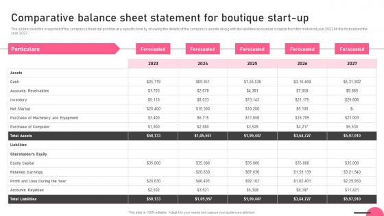 The slides cover the snapshot of the companys financial position at a specific time by showing the details of the companys assets along with its liabilities and owners capital from the historical year 2023 till the forecasted the year 2027. There are so many reasons you need a Comparative Balance Sheet Statement For Boutique Start Up Boutique Business Download Pdf. The first reason is you can not spend time making everything from scratch, Thus, Slidegeeks has made presentation templates for you too. You can easily download these templates from our website easily. The slides cover the snapshot of the companys financial position at a specific time by showing the details of the companys assets along with its liabilities and owners capital from the historical year 2023 till the forecasted the year 2027.