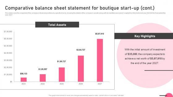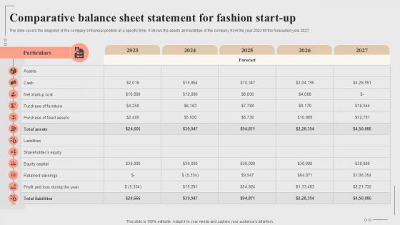 The slide covers the snapshot of the companys financial position at a specific time. It shows the assets and liabilities of the company from the year 2023 till the forecasted year 2027. Want to ace your presentation in front of a live audience Our Comparative Balance Sheet Statement For Fashion Start Up Fashion Startup Roadmap Plan Ppt Slide BP SS V can help you do that by engaging all the users towards you. Slidegeeks experts have put their efforts and expertise into creating these impeccable powerpoint presentations so that you can communicate your ideas clearly. Moreover, all the templates are customizable, and easy-to-edit and downloadable. Use these for both personal and commercial use. The slide covers the snapshot of the companys financial position at a specific time. It shows the assets and liabilities of the company from the year 2023 till the forecasted year 2027.