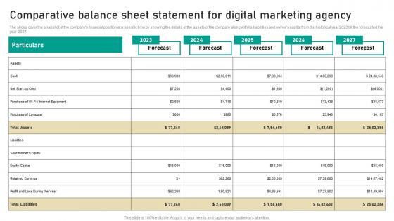 The slides cover the snapshot of the companys financial position at a specific time by showing the details of the assets of the company along with its liabilities and owners capital from the historical year 2023 till the forecasted the year 2027. Do you have to make sure that everyone on your team knows about any specific topic I yes, then you should give Comparative Balance Sheet Statement For Digital Marketing Business Professional Pdf a try. Our experts have put a lot of knowledge and effort into creating this impeccable Comparative Balance Sheet Statement For Digital Marketing Business Professional Pdf. You can use this template for your upcoming presentations, as the slides are perfect to represent even the tiniest detail. You can download these templates from the Slidegeeks website and these are easy to edit. So grab these today The slides cover the snapshot of the companys financial position at a specific time by showing the details of the assets of the company along with its liabilities and owners capital from the historical year 2023 till the forecasted the year 2027.