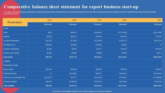 The slides cover the information related to the companys financial position at a specific time by showing the details of the assets of the company along with its liabilities and owners capital from the historical year 2023 till the forecasted year 2027. There are so many reasons you need a Comparative Balance Sheet Statement For Export Business Start Up Export Business Plan Topics Pdf The first reason is you can not spend time making everything from scratch, Thus, Slidegeeks has made presentation templates for you too. You can easily download these templates from our website easily. The slides cover the information related to the companys financial position at a specific time by showing the details of the assets of the company along with its liabilities and owners capital from the historical year 2023 till the forecasted year 2027.