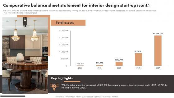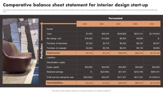 The slides cover the snapshot of the companys financial position at a specific time by showing the details of the companys assets along with its liabilities and owners capital from the historical year 2023 till the forecasted the year 2027. Coming up with a presentation necessitates that the majority of the effort goes into the content and the message you intend to convey. The visuals of a PowerPoint presentation can only be effective if it supplements and supports the story that is being told. Keeping this in mind our experts created Comparative Balance Sheet Statement For Interior Design Start Up Luxury Interior Design Inspiration Pdf to reduce the time that goes into designing the presentation. This way, you can concentrate on the message while our designers take care of providing you with the right template for the situation. The slides cover the snapshot of the companys financial position at a specific time by showing the details of the companys assets along with its liabilities and owners capital from the historical year 2023 till the forecasted the year 2027.