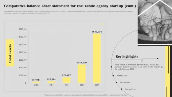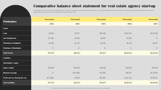 The slides cover the information related to the companys financial position at a specific time by showing the details of the assets of the company along with its liabilities and owners capital from the historical year 2023 till the forecasted year 2027. Want to ace your presentation in front of a live audience Our Comparative Balance Sheet Statement For Real Estate Agency Start Up Pictures Pdf can help you do that by engaging all the users towards you. Slidegeeks experts have put their efforts and expertise into creating these impeccable powerpoint presentations so that you can communicate your ideas clearly. Moreover, all the templates are customizable, and easy to edit and downloadable. Use these for both personal and commercial use. The slides cover the information related to the companys financial position at a specific time by showing the details of the assets of the company along with its liabilities and owners capital from the historical year 2023 till the forecasted year 2027.