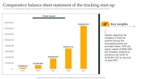 The slides cover the snapshot of the companys financial position at a specific time. It shows the assets and liabilities of the company from the year 2023 till the forecasted year 2027.Slidegeeks is one of the best resources for PowerPoint templates. You can download easily and regulate Comparative Balance Sheet Statement Freight Trucking Business Plan Infographics Pdf for your personal presentations from our wonderful collection. A few clicks is all it takes to discover and get the most relevant and appropriate templates. Use our Templates to add a unique zing and appeal to your presentation and meetings. All the slides are easy to edit and you can use them even for advertisement purposes. The slides cover the snapshot of the companys financial position at a specific time. It shows the assets and liabilities of the company from the year 2023 till the forecasted year 2027.