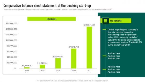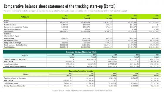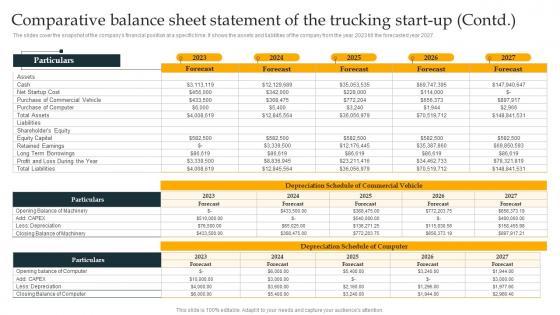 The slides cover the snapshot of the companys financial position at a specific time. It shows the assets and liabilities of the company from the year 2023 till the forecasted year 2027.Slidegeeks is one of the best resources for PowerPoint templates. You can download easily and regulate Comparative Balance Sheet Statement Trucking Services Business Plan Download Pdf for your personal presentations from our wonderful collection. A few clicks is all it takes to discover and get the most relevant and appropriate templates. Use our Templates to add a unique zing and appeal to your presentation and meetings. All the slides are easy to edit and you can use them even for advertisement purposes. The slides cover the snapshot of the companys financial position at a specific time. It shows the assets and liabilities of the company from the year 2023 till the forecasted year 2027.