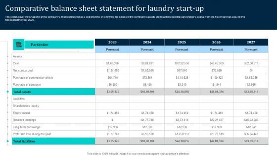 Want to ace your presentation in front of a live audience Our Comparative Balance Sheet Statement On Demand Laundry Business Plan Topics Pdf can help you do that by engaging all the users towards you.. Slidegeeks experts have put their efforts and expertise into creating these impeccable powerpoint presentations so that you can communicate your ideas clearly. Moreover, all the templates are customizable, and easy to edit and downloadable. Use these for both personal and commercial use. The slides cover the snapshot of the companys financial position at a specific time by showing the details of the companys assets along with its liabilities and owners capital from the historical year 2023 till the forecasted the year 2027.