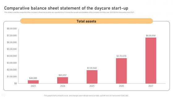 The slides cover the snapshot of the companys financial position at a specific time. It shows the assets and liabilities of the company from the year 2023 till the forecasted year 2027. Slidegeeks is one of the best resources for PowerPoint templates. You can download easily and regulate Comparative Balance Sheet Statement Of The Childcare Business Plan Template Pdf for your personal presentations from our wonderful collection. A few clicks is all it takes to discover and get the most relevant and appropriate templates. Use our Templates to add a unique zing and appeal to your presentation and meetings. All the slides are easy to edit and you can use them even for advertisement purposes. The slides cover the snapshot of the companys financial position at a specific time. It shows the assets and liabilities of the company from the year 2023 till the forecasted year 2027.