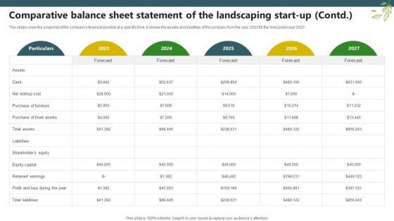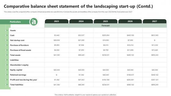 The slides cover the snapshot of the companys financial position at a specific time. It shows the assets and liabilities of the company from the year 2023 till the forecasted year 2027. Slidegeeks is one of the best resources for PowerPoint templates. You can download easily and regulate Comparative Balance Sheet Statement Of The Landscaping Start Up Lawn Care BP SS V for your personal presentations from our wonderful collection. A few clicks is all it takes to discover and get the most relevant and appropriate templates. Use our Templates to add a unique zing and appeal to your presentation and meetings. All the slides are easy to edit and you can use them even for advertisement purposes. The slides cover the snapshot of the companys financial position at a specific time. It shows the assets and liabilities of the company from the year 2023 till the forecasted year 2027.