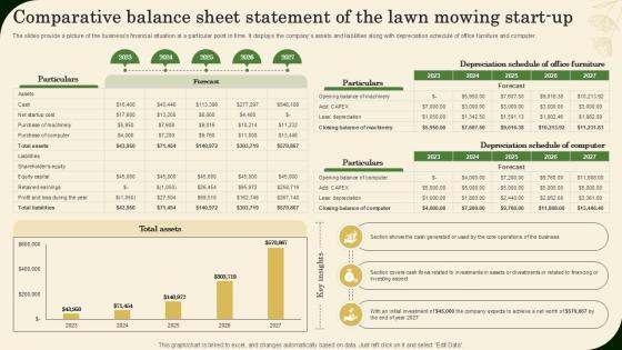 The slides provide a picture of the business financial situation at a particular point in time. It displays the company assets and liabilities along with depreciation schedule of office furniture and computer. Get a simple yet stunning designed Lawn Care Services Business Plan Comparative Balance Sheet Statement Of The Lawn Mowing Start BP SS V. It is the best one to establish the tone in your meetings. It is an excellent way to make your presentations highly effective. So, download this PPT today from Slidegeeks and see the positive impacts. Our easy-to-edit Lawn Care Services Business Plan Comparative Balance Sheet Statement Of The Lawn Mowing Start BP SS V can be your go-to option for all upcoming conferences and meetings. So, what are you waiting for Grab this template today. The slides provide a picture of the business financial situation at a particular point in time. It displays the company assets and liabilities along with depreciation schedule of office furniture and computer.