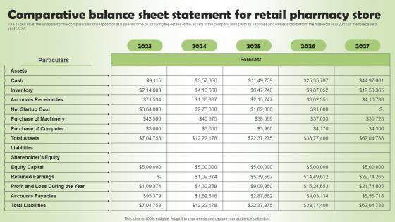The slides cover the snapshot of the companys financial position at a specific time by showing the details of the assets of the company along with its liabilities and owners capital from the historical year 2023 till the forecasted year 2027. Get a simple yet stunning designed Comparative Balance Sheet Statement Pharmacy Business Plan Go To Market Strategy Inspiration Pdf. It is the best one to establish the tone in your meetings. It is an excellent way to make your presentations highly effective. So, download this PPT today from Slidegeeks and see the positive impacts. Our easy to edit Comparative Balance Sheet Statement Pharmacy Business Plan Go To Market Strategy Inspiration Pdf can be your go to option for all upcoming conferences and meetings. So, what are you waiting for Grab this template today. The slides cover the snapshot of the companys financial position at a specific time by showing the details of the assets of the company along with its liabilities and owners capital from the historical year 2023 till the forecasted year 2027.