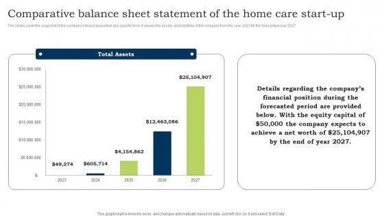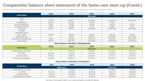 The slides cover the snapshot of the companys financial position at a specific time. It shows the assets and liabilities of the company from the year 2023 till the forecasted year 2027. Slidegeeks is one of the best resources for PowerPoint templates. You can download easily and regulate Comparative Balance Sheet Statement Of The In Home Care Business Plan Template Pdf for your personal presentations from our wonderful collection. A few clicks is all it takes to discover and get the most relevant and appropriate templates. Use our Templates to add a unique zing and appeal to your presentation and meetings. All the slides are easy to edit and you can use them even for advertisement purposes. The slides cover the snapshot of the companys financial position at a specific time. It shows the assets and liabilities of the company from the year 2023 till the forecasted year 2027.