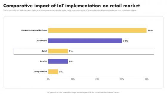 The following slide highlights the impact of Internet of things implementation in retail sector. It also compares impact of IoT on manufacturing and business, healthcare, security and transportation Boost your pitch with our creative Comparative Impact IoT How Industrial IoT Is Changing Worldwide Microsoft Pdf. Deliver an awe inspiring pitch that will mesmerize everyone. Using these presentation templates you will surely catch everyones attention. You can browse the ppts collection on our website. We have researchers who are experts at creating the right content for the templates. So you do not have to invest time in any additional work. Just grab the template now and use them. The following slide highlights the impact of Internet of things implementation in retail sector. It also compares impact of IoT on manufacturing and business, healthcare, security and transportation
