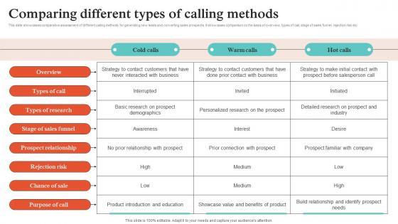This slide showcases comparative assessment of different calling methods for generating new leads and converting sales prospects. It showcases comparison on the basis of overview, types of call, stage of sales funnel, rejection risk etc. From laying roadmaps to briefing everything in detail, our templates are perfect for you. You can set the stage with your presentation slides. All you have to do is download these easy-to-edit and customizable templates. Phone Sales Strategy To Drive Comparing Different Types Of Calling Methods Strategy SS V will help you deliver an outstanding performance that everyone would remember and praise you for. Do download this presentation today. This slide showcases comparative assessment of different calling methods for generating new leads and converting sales prospects. It showcases comparison on the basis of overview, types of call, stage of sales funnel, rejection risk etc.