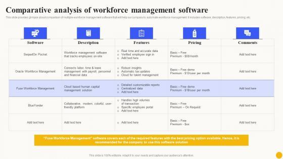 This slide provides glimpse about comparison of multiple workforce management software that will help our company to automate workforce management. It includes software, description, features, pricing, etc.From laying roadmaps to briefing everything in detail, our templates are perfect for you. You can set the stage with your presentation slides. All you have to do is download these easy-to-edit and customizable templates. Comparative Analysis Of Workforce Planned Workforce Enhancement Themes Pdf will help you deliver an outstanding performance that everyone would remember and praise you for. Do download this presentation today. This slide provides glimpse about comparison of multiple workforce management software that will help our company to automate workforce management. It includes software, description, features, pricing, etc.