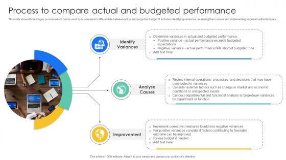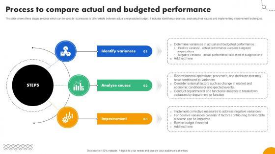 This slide shows three stages process which can be used by businesses to differentiate between actual and projected budget. It includes identifying variances, analysing their causes and implementing improvement techniques. Do you know about Slidesgeeks Process To Compare Actual And Budgeted Effective And Efficient Tools To Develop Fin SS V These are perfect for delivering any kind od presentation. Using it, create PowerPoint presentations that communicate your ideas and engage audiences. Save time and effort by using our pre-designed presentation templates that are perfect for a wide range of topic. Our vast selection of designs covers a range of styles, from creative to business, and are all highly customizable and easy to edit. Download as a PowerPoint template or use them as Google Slides themes. This slide shows three stages process which can be used by businesses to differentiate between actual and projected budget. It includes identifying variances, analysing their causes and implementing improvement techniques. .