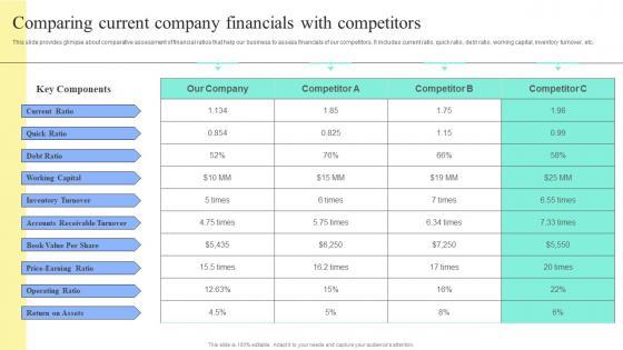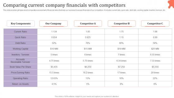 This slide provides glimpse about comparative assessment of financial ratios that help our business to assess financials of our competitors. It includes current ratio, quick ratio, debt ratio, working capital, inventory turnover, etc.Explore a selection of the finest Comparing Current Company Financials With Tactical Financial Governance Template Pdf here. With a plethora of professionally designed and pre-made slide templates, you can quickly and easily find the right one for your upcoming presentation. You can use our Comparing Current Company Financials With Tactical Financial Governance Template Pdf to effectively convey your message to a wider audience. Slidegeeks has done a lot of research before preparing these presentation templates. The content can be personalized and the slides are highly editable. Grab templates today from Slidegeeks. This slide provides glimpse about comparative assessment of financial ratios that help our business to assess financials of our competitors. It includes current ratio, quick ratio, debt ratio, working capital, inventory turnover, etc.