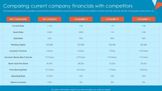 This slide provides glimpse about comparative assessment of financial ratios that help our business to assess financials of our competitors. It includes current ratio, quick ratio, debt ratio, working capital, inventory turnover, etc. This modern and well arranged Adjusting Financial Strategies And Planning Comparing Current Company Financials With Competitors Sample PDF provides lots of creative possibilities. It is very simple to customize and edit with the Powerpoint Software. Just drag and drop your pictures into the shapes. All facets of this template can be edited with Powerpoint no extra software is necessary. Add your own material, put your images in the places assigned for them, adjust the colors, and then you can show your slides to the world, with an animated slide included.
