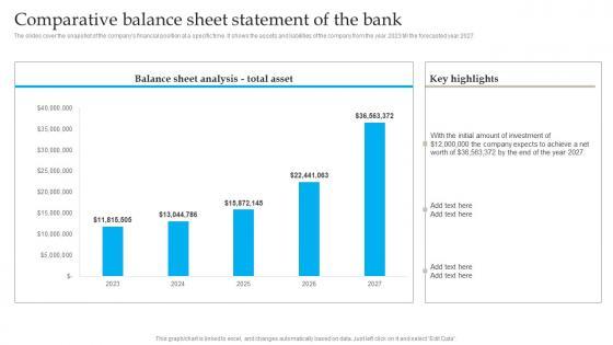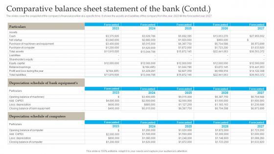 The slides cover the snapshot of the companys financial position at a specific time. It shows the assets and liabilities of the company from the year 2023 till the forecasted year 2027. Do you have to make sure that everyone on your team knows about any specific topic I yes, then you should give Comparative Balance Sheet Statement Banking Industry Business Plan Go To Market Strategy Template Pdf a try. Our experts have put a lot of knowledge and effort into creating this impeccable Comparative Balance Sheet Statement Banking Industry Business Plan Go To Market Strategy Template Pdf. You can use this template for your upcoming presentations, as the slides are perfect to represent even the tiniest detail. You can download these templates from the Slidegeeks website and these are easy to edit. So grab these today The slides cover the snapshot of the companys financial position at a specific time. It shows the assets and liabilities of the company from the year 2023 till the forecasted year 2027.