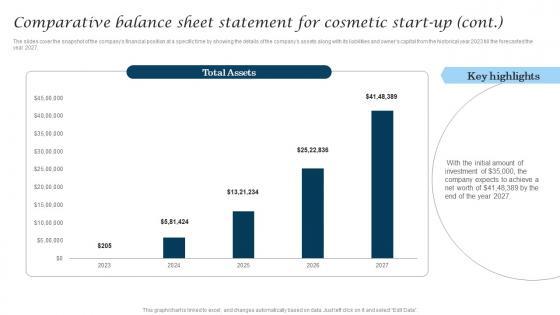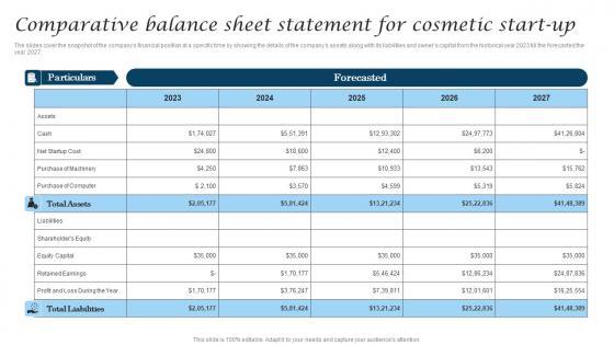 The slides cover the snapshot of the companys financial position at a specific time by showing the details of the companys assets along with its liabilities and owners capital from the historical year 2023 till the forecasted the year 2027. Get a simple yet stunning designed Comparative Balance Sheet Statement For Cosmetic Industry Business Information Pdf. It is the best one to establish the tone in your meetings. It is an excellent way to make your presentations highly effective. So, download this PPT today from Slidegeeks and see the positive impacts. Our easy-to-edit Comparative Balance Sheet Statement For Cosmetic Industry Business Information Pdf can be your go-to option for all upcoming conferences and meetings. So, what are you waiting for Grab this template today. The slides cover the snapshot of the companys financial position at a specific time by showing the details of the companys assets along with its liabilities and owners capital from the historical year 2023 till the forecasted the year 2027.