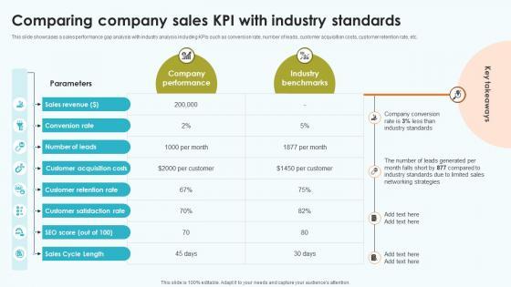 This slide showcases a sales performance gap analysis with industry analysis including KPIs such as conversion rate, number of leads, customer acquisition costs, customer retention rate, etc. Get a simple yet stunning designed Elevating Sales Networks Comparing Company Sales KPI With Industry Standards SA SS V. It is the best one to establish the tone in your meetings. It is an excellent way to make your presentations highly effective. So, download this PPT today from Slidegeeks and see the positive impacts. Our easy-to-edit Elevating Sales Networks Comparing Company Sales KPI With Industry Standards SA SS V can be your go-to option for all upcoming conferences and meetings. So, what are you waiting for Grab this template today. This slide showcases a sales performance gap analysis with industry analysis including KPIs such as conversion rate, number of leads, customer acquisition costs, customer retention rate, etc.