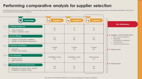 The following slide showcases comparative assessment of multiple suppliers to select the best and ensure excellent performance. It includes elements such as industry experience, customization capabilities, order tracking, pricing structure, discounts, problem solving etc. If your project calls for a presentation, then Slidegeeks is your go-to partner because we have professionally designed, easy-to-edit templates that are perfect for any presentation. After downloading, you can easily edit Performing Comparative Analysis For Supplier Selection Manufacturing Strategy Driving Industry 4 0 and make the changes accordingly. You can rearrange slides or fill them with different images. Check out all the handy templates The following slide showcases comparative assessment of multiple suppliers to select the best and ensure excellent performance. It includes elements such as industry experience, customization capabilities, order tracking, pricing structure, discounts, problem solving etc.
