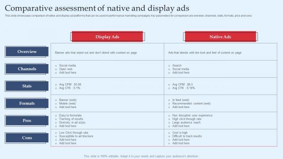 This slide showcases comparison of native and display ad platforms that can be used in performance marketing campaigns. Key parameters for comparison are overview, channels, stats, formats, pros and cons. Slidegeeks is here to make your presentations a breeze with Performance Based Marketing Comparative Assessment Of Native And Display Ads Introduction PDF With our easy-to-use and customizable templates, you can focus on delivering your ideas rather than worrying about formatting. With a variety of designs to choose from, youre sure to find one that suits your needs. And with animations and unique photos, illustrations, and fonts, you can make your presentation pop. So whether youre giving a sales pitch or presenting to the board, make sure to check out Slidegeeks first.