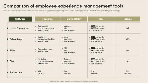 This slide shows comparative analysis of software which can be used by organizations to provide great and positive employee experience. It includes features, compatibility, price and ratings. From laying roadmaps to briefing everything in detail, our templates are perfect for you. You can set the stage with your presentation slides. All you have to do is download these easy-to-edit and customizable templates. Comparison Of Employee Experience Management Plan To Develop Ppt Example will help you deliver an outstanding performance that everyone would remember and praise you for. Do download this presentation today. This slide shows comparative analysis of software which can be used by organizations to provide great and positive employee experience. It includes features, compatibility, price and ratings.