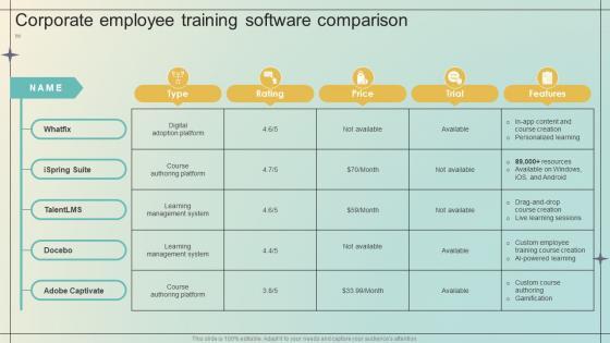 This slide includes Corporate employee training software comparison among features, price, rating, trial etc. Do you have to make sure that everyone on your team knows about any specific topic I yes, then you should give Immersive Training For Practical Corporate Employee Training Software Comparison DTE SS V a try. Our experts have put a lot of knowledge and effort into creating this impeccable Immersive Training For Practical Corporate Employee Training Software Comparison DTE SS V. You can use this template for your upcoming presentations, as the slides are perfect to represent even the tiniest detail. You can download these templates from the Slidegeeks website and these are easy to edit. So grab these today This slide includes Corporate employee training software comparison among features, price, rating, trial etc.