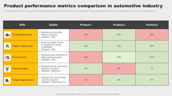 This slide includes the KPI comparison for automotive industry product performance to enhance product management. This includes various KPIs such as on time delivery rate, inventory turns, scrap and reject, etc. Showcasing this set of slides titled Product Performance Metrics Comparison In Automotive Industry Topics Pdf. The topics addressed in these templates are Inventory Turns, Supplier Quality Score, Energy Usage And Cost. All the content presented in this PPT design is completely editable. Download it and make adjustments in color, background, font etc. as per your unique business setting. This slide includes the KPI comparison for automotive industry product performance to enhance product management. This includes various KPIs such as on time delivery rate, inventory turns, scrap and reject, etc.