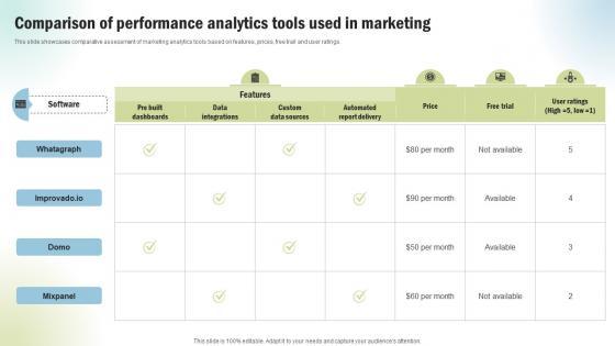 This slide showcases comparative assessment of marketing analytics tools based on features, prices, free trail and user ratings. Do you have an important presentation coming up Are you looking for something that will make your presentation stand out from the rest Look no further than Project Benchmarking Process Comparison Of Performance Analytics Tools Used CRP DK SS V. With our professional designs, you can trust that your presentation will pop and make delivering it a smooth process. And with Slidegeeks, you can trust that your presentation will be unique and memorable. So why wait Grab Project Benchmarking Process Comparison Of Performance Analytics Tools Used CRP DK SS V today and make your presentation stand out from the rest This slide showcases comparative assessment of marketing analytics tools based on features, prices, free trail and user ratings.