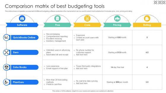 This slide shows comparative assessment of different budgeting software available in the market which can be used to select most suitable tool. It includes pros, cons, pricing and rating. Slidegeeks is here to make your presentations a breeze with Comparison Matrix Of Best Budgeting Tools Effective And Efficient Tools To Develop Fin SS V With our easy-to-use and customizable templates, you can focus on delivering your ideas rather than worrying about formatting. With a variety of designs to choose from, you are sure to find one that suits your needs. And with animations and unique photos, illustrations, and fonts, you can make your presentation pop. So whether you are giving a sales pitch or presenting to the board, make sure to check out Slidegeeks first This slide shows comparative assessment of different budgeting software available in the market which can be used to select most suitable tool. It includes pros, cons, pricing and rating.