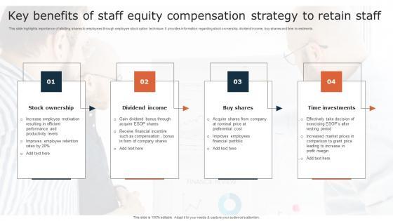 This slide highlights importance of allotting shares to employees through employee stock option technique. It provides information regarding stock ownership, dividend income, buy shares and time investments. Showcasing this set of slides titled Key Benefits Of Staff Equity Compensation Strategy To Retain Staff Pictures Pdf. The topics addressed in these templates are Stock Ownership, Dividend Income, Buy Shares. All the content presented in this PPT design is completely editable. Download it and make adjustments in color, background, font etc. as per your unique business setting. This slide highlights importance of allotting shares to employees through employee stock option technique. It provides information regarding stock ownership, dividend income, buy shares and time investments.