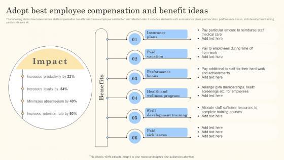 The following slide showcases various staff compensation benefits to increase employee satisfaction and retention rate. It includes elements such as insurance plans, paid vacation, performance bonus, skill development training, paid sick leaves etc.Crafting an eye-catching presentation has never been more straightforward. Let your presentation shine with this tasteful yet straightforward Adopt Best Employee Compensation And Action Steps For Employee Engagement Guidelines Pdf template. It offers a minimalistic and classy look that is great for making a statement. The colors have been employed intelligently to add a bit of playfulness while still remaining professional. Construct the ideal Adopt Best Employee Compensation And Action Steps For Employee Engagement Guidelines Pdf that effortlessly grabs the attention of your audience. Begin now and be certain to wow your customers. The following slide showcases various staff compensation benefits to increase employee satisfaction and retention rate. It includes elements such as insurance plans, paid vacation, performance bonus, skill development training, paid sick leaves etc.