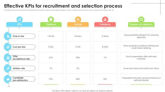 This slide shows main key performance indicators that are used to measure various aspects related to hiring. It include KPIs such as time to hire, cost per hire and attrition rate, etc. Whether you have daily or monthly meetings, a brilliant presentation is necessary. Effective KPIs For Recruitment Employee Attraction And Competency Ppt Presentation can be your best option for delivering a presentation. Represent everything in detail using Effective KPIs For Recruitment Employee Attraction And Competency Ppt Presentation and make yourself stand out in meetings. The template is versatile and follows a structure that will cater to your requirements. All the templates prepared by Slidegeeks are easy to download and edit. Our research experts have taken care of the corporate themes as well. So, give it a try and see the results. This slide shows main key performance indicators that are used to measure various aspects related to hiring. It include KPIs such as time to hire, cost per hire and attrition rate, etc.