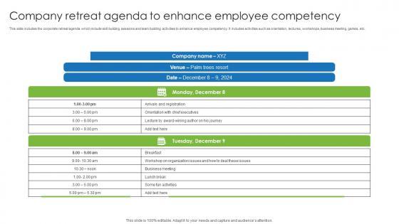 This slide includes the corporate retreat agenda which include skill building sessions and team building activities to enhance employee competency. It includes activities such as orientation, lectures, workshops, business meeting, games, etc. Showcasing this set of slides titled Company Retreat Agenda To Enhance Employee Competency Designs Pdf. The topics addressed in these templates are Competency, Company, Agenda. All the content presented in this PPT design is completely editable. Download it and make adjustments in color, background, font etc. as per your unique business setting. This slide includes the corporate retreat agenda which include skill building sessions and team building activities to enhance employee competency. It includes activities such as orientation, lectures, workshops, business meeting, games, etc.