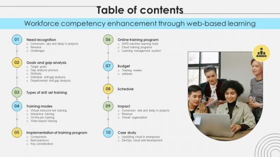 Create an editable Table Of Contents For Workforce Competency Enhancement Through Web Based Learning DTE SS V that communicates your idea and engages your audience. Whether you are presenting a business or an educational presentation, pre-designed presentation templates help save time. Table Of Contents For Workforce Competency Enhancement Through Web Based Learning DTE SS V is highly customizable and very easy to edit, covering many different styles from creative to business presentations. Slidegeeks has creative team members who have crafted amazing templates. So, go and get them without any delay. Our Table Of Contents For Workforce Competency Enhancement Through Web Based Learning DTE SS V are topically designed to provide an attractive backdrop to any subject. Use them to look like a presentation pro.