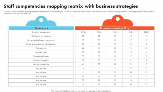 This slide shows the matrix for mapping employee competencies to business strategies. The purpose of this slides to evaluate the executives response .It includes various parameters such as corporate expansion, business performance , change management, etc. Showcasing this set of slides titled Staff Competencies Mapping Matrix With Business Strategies Microsoft Pdf The topics addressed in these templates are Parameters, Various Departments, Business Units All the content presented in this PPT design is completely editable. Download it and make adjustments in color, background, font etc. as per your unique business setting. This slide shows the matrix for mapping employee competencies to business strategies. The purpose of this slides to evaluate the executives response .It includes various parameters such as corporate expansion, business performance , change management, etc.