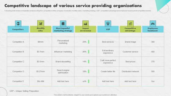Following slide shows comparative analysis of top five competitors of the company. It includes monthly sales, marketing strategy, USP, competitive advantage and employee headcount of competitive brands. Want to ace your presentation in front of a live audience Our Competitive Landscape Of Developing An Impactful SEO Marketing Plan Designs Pdf can help you do that by engaging all the users towards you. Slidegeeks experts have put their efforts and expertise into creating these impeccable powerpoint presentations so that you can communicate your ideas clearly. Moreover, all the templates are customizable, and easy to edit and downloadable. Use these for both personal and commercial use. Following slide shows comparative analysis of top five competitors of the company. It includes monthly sales, marketing strategy, USP, competitive advantage and employee headcount of competitive brands.