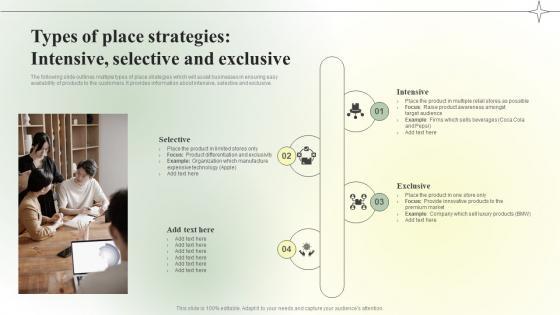 The following slide outlines multiple types of place strategies which will assist businesses in ensuring easy availability of products to the customers. It provides information about intensive, selective and exclusive. Retrieve professionally designed Types Of Place Strategies Intensive Branding Strategy To Gain Competitive Edge Topics Pdf to effectively convey your message and captivate your listeners. Save time by selecting pre made slideshows that are appropriate for various topics, from business to educational purposes. These themes come in many different styles, from creative to corporate, and all of them are easily adjustable and can be edited quickly. Access them as PowerPoint templates or as Google Slides themes. You do not have to go on a hunt for the perfect presentation because Slidegeeks got you covered from everywhere. The following slide outlines multiple types of place strategies which will assist businesses in ensuring easy availability of products to the customers. It provides information about intensive, selective and exclusive.