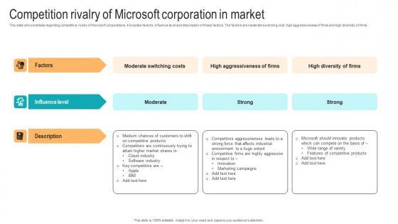 This slide shows details regarding competitive rivalry of Microsoft corporations. It includes factors, influence level and description of these factors. The factors are moderate switching cost, high aggressiveness of firms and high diversity of firms. Slidegeeks is here to make your presentations a breeze with Competition Rivalry Of Microsoft Corporation Strategic Advancements By Microsofts Background Pdf With our easy-to-use and customizable templates, you can focus on delivering your ideas rather than worrying about formatting. With a variety of designs to choose from, you are sure to find one that suits your needs. And with animations and unique photos, illustrations, and fonts, you can make your presentation pop. So whether you are giving a sales pitch or presenting to the board, make sure to check out Slidegeeks first This slide shows details regarding competitive rivalry of Microsoft corporations. It includes factors, influence level and description of these factors. The factors are moderate switching cost, high aggressiveness of firms and high diversity of firms.