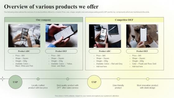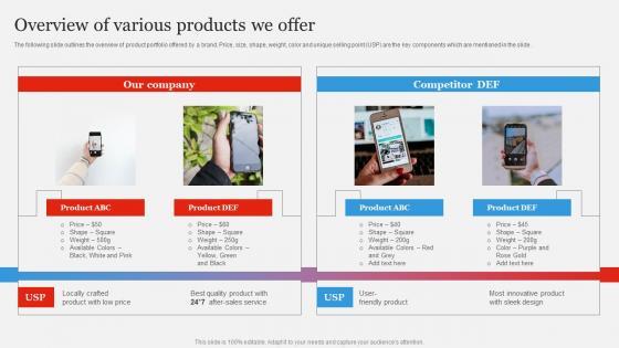 The following slide outlines the overview of product portfolio offered by a brand. Price, size, shape, weight, color and unique selling point USP are the key components which are mentioned in the slide. Formulating a presentation can take up a lot of effort and time, so the content and message should always be the primary focus. The visuals of the PowerPoint can enhance the presenters message, so our Competitive Branding Strategic Overview Of Various Products We Offer Inspiration PDF was created to help save time. Instead of worrying about the design, the presenter can concentrate on the message while our designers work on creating the ideal templates for whatever situation is needed. Slidegeeks has experts for everything from amazing designs to valuable content, we have put everything into Competitive Branding Strategic Overview Of Various Products We Offer Inspiration PDF The following slide outlines the overview of product portfolio offered by a brand. Price, size, shape, weight, color and unique selling point USP are the key components which are mentioned in the slide.