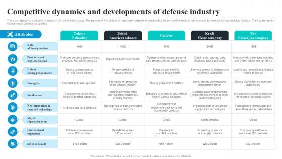 The slide represents a detailed overview of competitive landscape. The purpose of this slide is to help stakeholders in understanding the competitive environment and aids in making informed strategic decision. The key players list include major Defense companies. There are so many reasons you need a Competitive Dynamics And Developments Global Security Industry PPT Template IR SS V. The first reason is you can not spend time making everything from scratch, Thus, Slidegeeks has made presentation templates for you too. You can easily download these templates from our website easily. The slide represents a detailed overview of competitive landscape. The purpose of this slide is to help stakeholders in understanding the competitive environment and aids in making informed strategic decision. The key players list include major Defense companies.